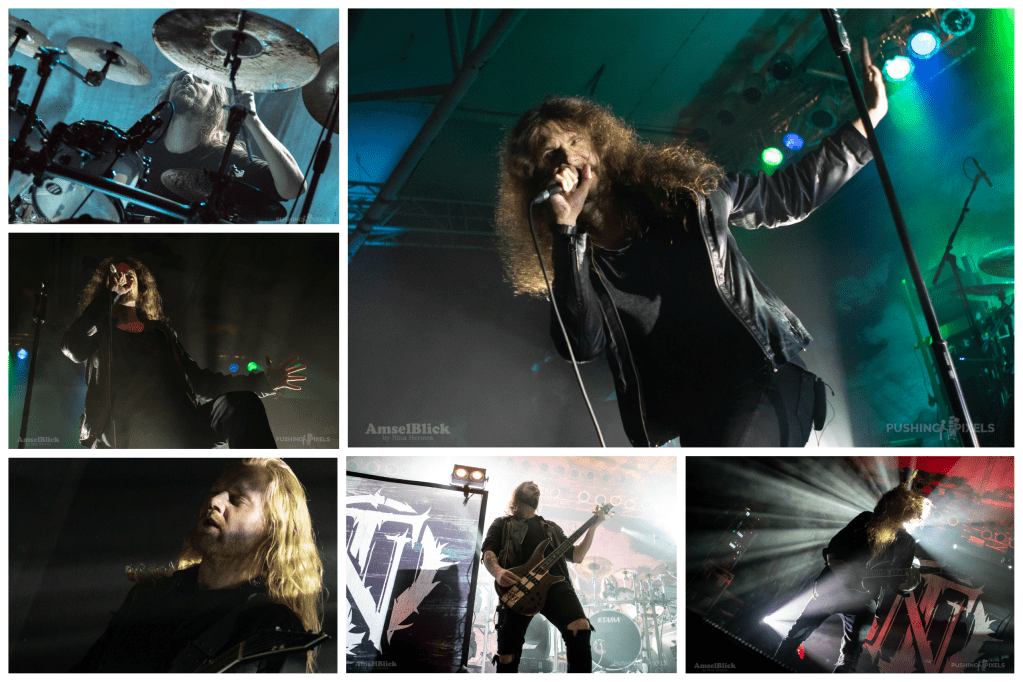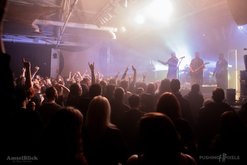 This became clear with the opener OCEANS: the Essigfabrik was maybe only half full when the guys entered the stage. OCEANS is a very young band: only founded in 2018, with their debut album „The Sun and the Cold“ just out and not too much stage experience yet, a lot of attention came upon them with this tour. And they did very well. The combination of atmospheric, a bit gloomy mood and powerful riffs, plus the haunting, emotionally charged voice of singer Timo Rotten convinced right away and also the interaction with the audience worked out skillfully. The applause for OCEANS showed that they had made friends and so one can only hope to see the guys on stage more often.