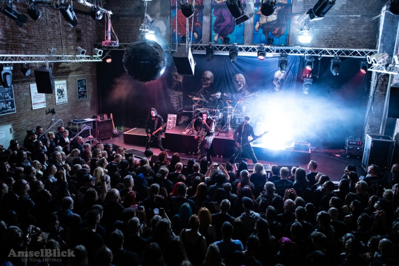 Einlass zum Kulttempel war für 19 Uhr geplant. Da das Konzert aber nun mal ausverkauft war und der Parkplatz direkt am Tempel nicht gerade riesig ist, dachte ich mir: besser etwas früher, als keinen Platz mehr zu bekommen. Damit war ich aber offensichtlich nicht die einzige, denn der Parkplatz war um 18 Uhr bereits gut gefüllt. Sowohl am Tempel als auch beim gegenüberliegenden Schnellrestaurant hielt sich bereits eine Vielzahl schwarzgekleideter Menschen auf, alle in freudiger Erwartung des Abends, und im Minutentakt kamen weitere Fans an. Als um Punkt 19 Uhr die Tür zum Kulttempel geöffnet wurde, hatte sich somit schon eine ordentliche Menge Menschen angesammelt, die nun in die Location strömten.